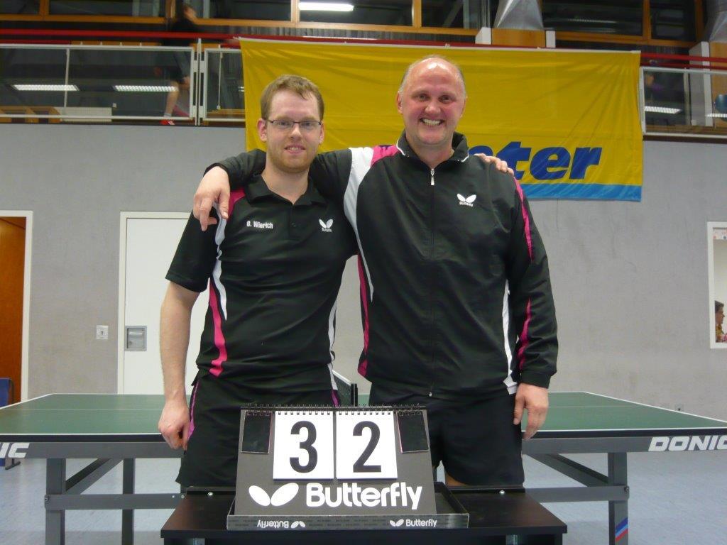 Oliver Wierich und Roland Hünteler erreichten in der bis 1450 TTR-Punkte offenen Herren-E-Klasse am Samstag den ersten Platz. Nach einer Gesamtdauer der Konkurrenz von unfassbaren 15,5 Stunden (!) schlugen die beiden Westerkappelner gegen 2 Uhr nachts eine Kombination des TuS Bartüddingdorf knapp mit 3:2. Überraschend auf dem dritten Rang in dieser Klasse landeten Philip Simon und Janeiro Wenzel, die in der Vorschlussrunde den späteren Siegern den Vortritt lassen mussten.