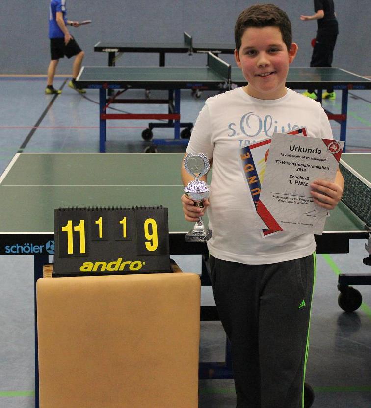 Die 12 B-Schüler spielten nur bis zum zweiten Gewinnst. Hier setzten die in der dritten Mannschaft spielenden Kinder ihre Erfahrungen aus. So setzten sich Claas Hünteler, Leon Walter und Luca Principato jeweils an die Spitze ihrer Vorrundengruppe. Hünteler bezwang im Viertelfinale Mannschaftskollege Robin Reese mit 2:0. Im zweiten Viertelfinale setzte sich Alicia Fortmann knapp mit 2:1 gegen Luca Reese durch. In der Vorschlussrunde gab es dann zwei deutliche Ergebnisse. Luca Principato besiegte Alicia Fortmann ebenso mit 2:0 wie auch Leon Walter Claas Hünteler. Das Endspiel war von Spannung geprägt. Luca konnte den ersten Satz mit 12:10 gegen Leon gewinnen. Der zweite Durchgang ging mit 13:11 an Leon. Im entscheidenden dritten Satz führte Leon schon mit 8:3, musste sich dennoch mit 9:11 geschlagen geben und dem strahlenden Gewinner Luca Principato zum Titel gratulieren.