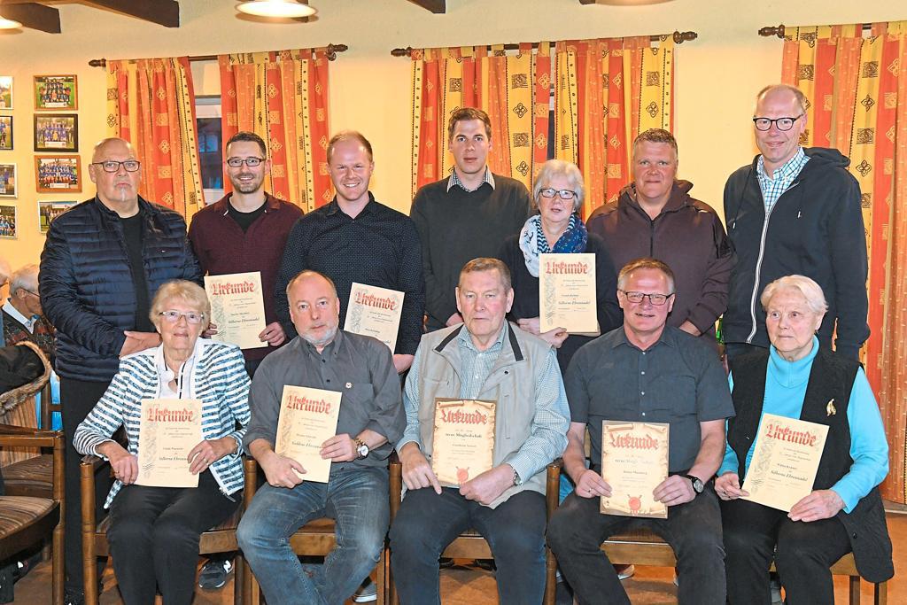 Wurden für ihre langjährige Mitgliedschaft geehrt: Reiner Schröder (25 Jahre), Rosemarie Krug (60), Kurt Kaleske (60), Brigitte Herden (50), Werner Herden (50), Uwe Schröder (50) (vorne von links); Wolf-Dietrich Häke (Vorsitzender), Nicole Buchwald (Abteilungsleiterin Turnen), Karin Littkemann (40 Jahre aktive Übungsleiterin), Jan Haferland (25), Sven Spellbrink (40) und Rainer Budke (2. Vorsitzender) (hinten von links).