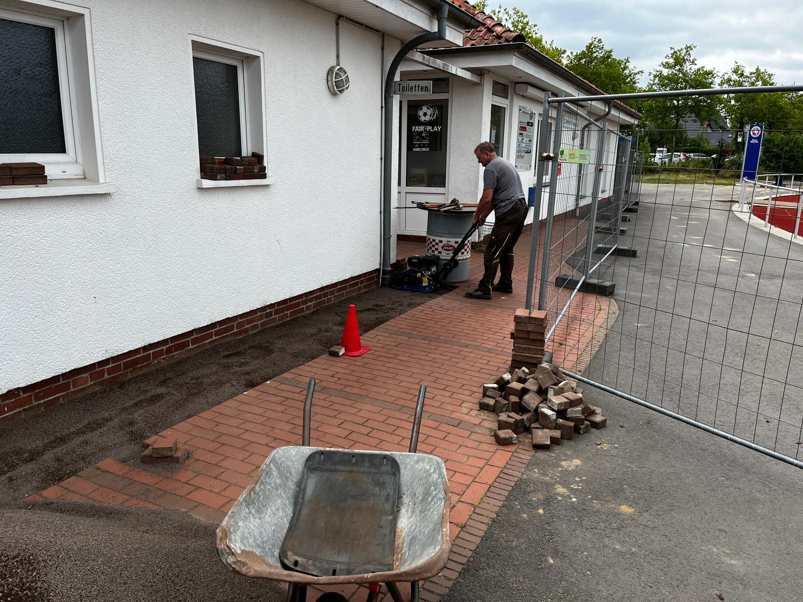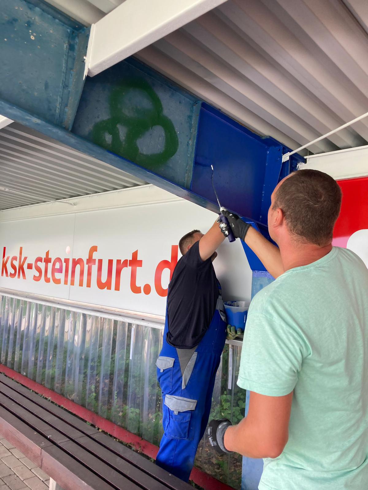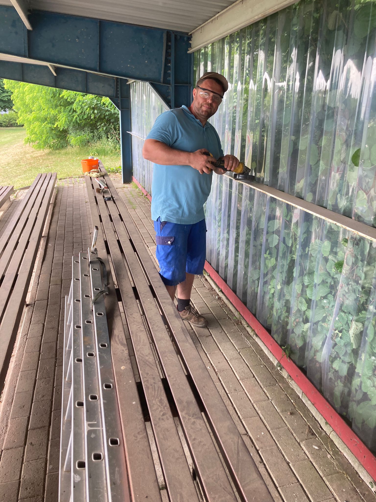 Angefangen wurde im August 2021 z.B. mit dem Reinigen der Dachrinnen des Clubheimes und der Umkleidekabinen im Hanfriedenstadion. Einen Monat später wurde der Kiosk am