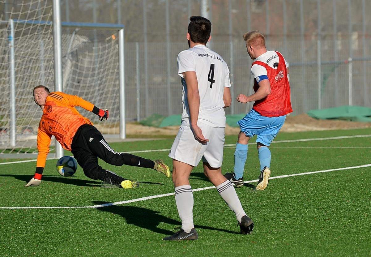 Bei frühlingsLeon Fischer trifft in dieser Szene zum wichtigen 1:0haften Bedingungen spielten wir am Sonntag auf Kunstrasen gegen SW Esch II. Das Hinspiel gewann man verdient aber knapp mit 0:1, weshalb wir eine knifflige Partie erwarteten. Dieser Eindruck bestätigte sich in der ersten Halbzeit auch, denn die Escher verteidigten grundsolide und ließen nur wenig zu. Allerdings stand auch die Westfaliadefensive sehr sicher. Nur bei vereinzelten, gut geschlagenen Standards musste man die Luft anhalten.
