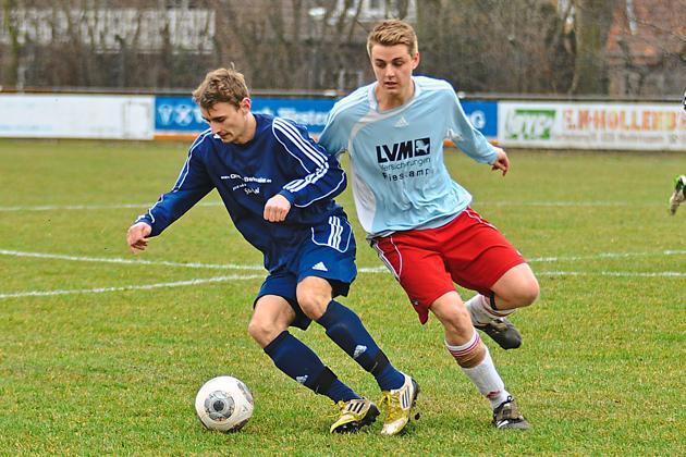 Marc Hesselbrock (rechts) farblich ansprechend gekleidet und hier im Zweikampf mit dem Saerbecker Torschützen Felix Steuter (Foto: WN)