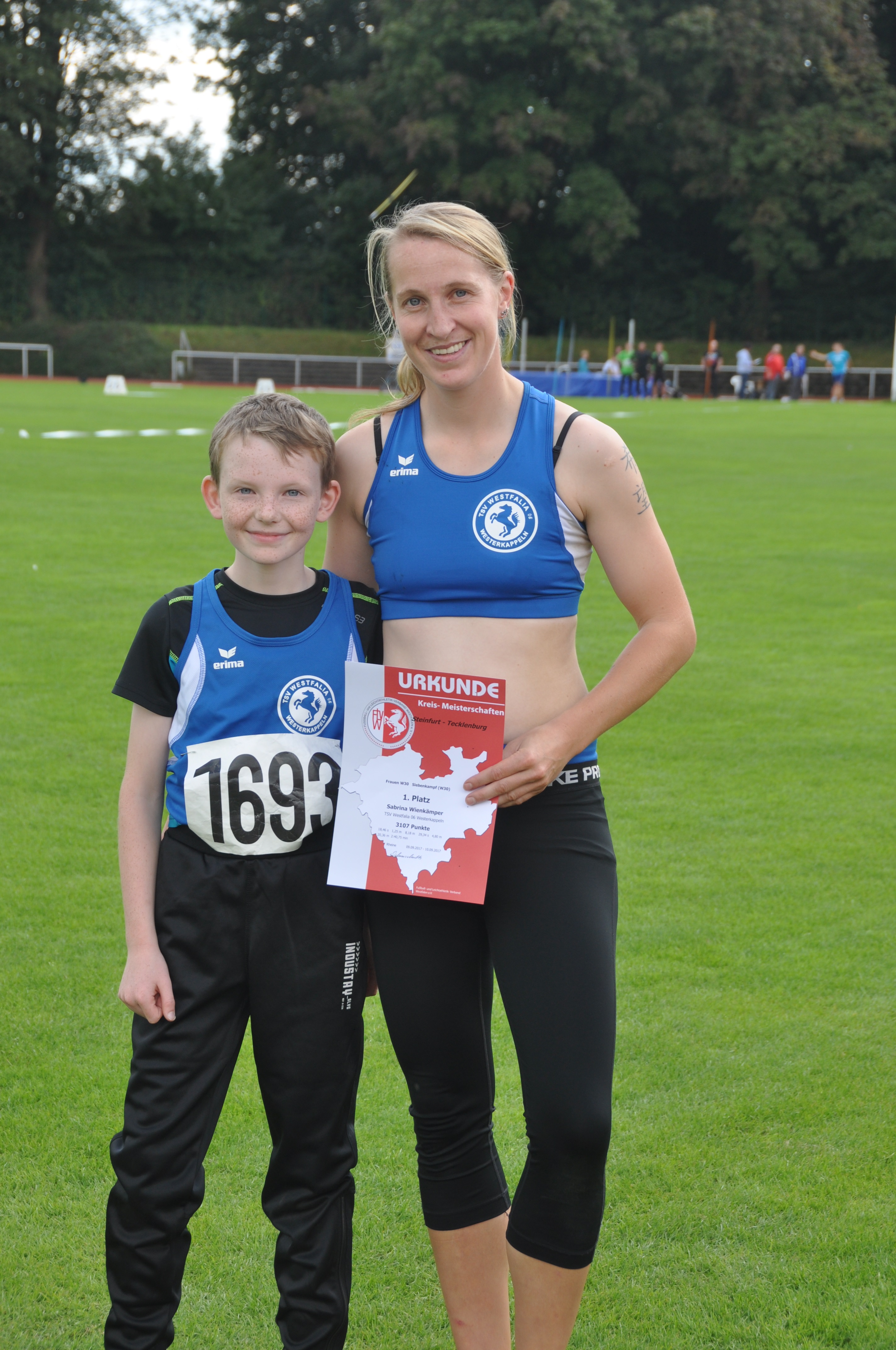 Bereits am Samstag waren die Westerkappelner in Rheine und Celle aktiv. Während Trainer Werner Korte bei den NLV und BLV-Meisterschaften der Senioren in Celle an den Start ging und mit 27,62m im Speerwurf der Senioren M80 seine Leistung vom vergangenen Wettkampf in Lohne deutlich steigerte, startete Sabrina Wienkämper bei den Münsterlandmeisterschaften in Rheine. Obwohl sie mittlerweile bereits bei den Seniorinnen startet, nahm sie am Wettbewerb der Frauen teil. Während sie über die 100m bereits im Vorlauf mit guten 14,03 Sekunden ausschied, belegte sie über die 100m Hürden einen guten dritten Podestplatz mit 18,28 Sekunden. Im Weitsprung wurde sie Fünfte und im Dreisprung erlangte sie mit 10,53m den Vize-Münsterlandmeister. Einen Tag später gingen in Rheine die Jüngeren an den Start und somit auch Finn Buchwald in der Altersklasse M12, wo er gleich zweimal auf dem Treppchen landete.