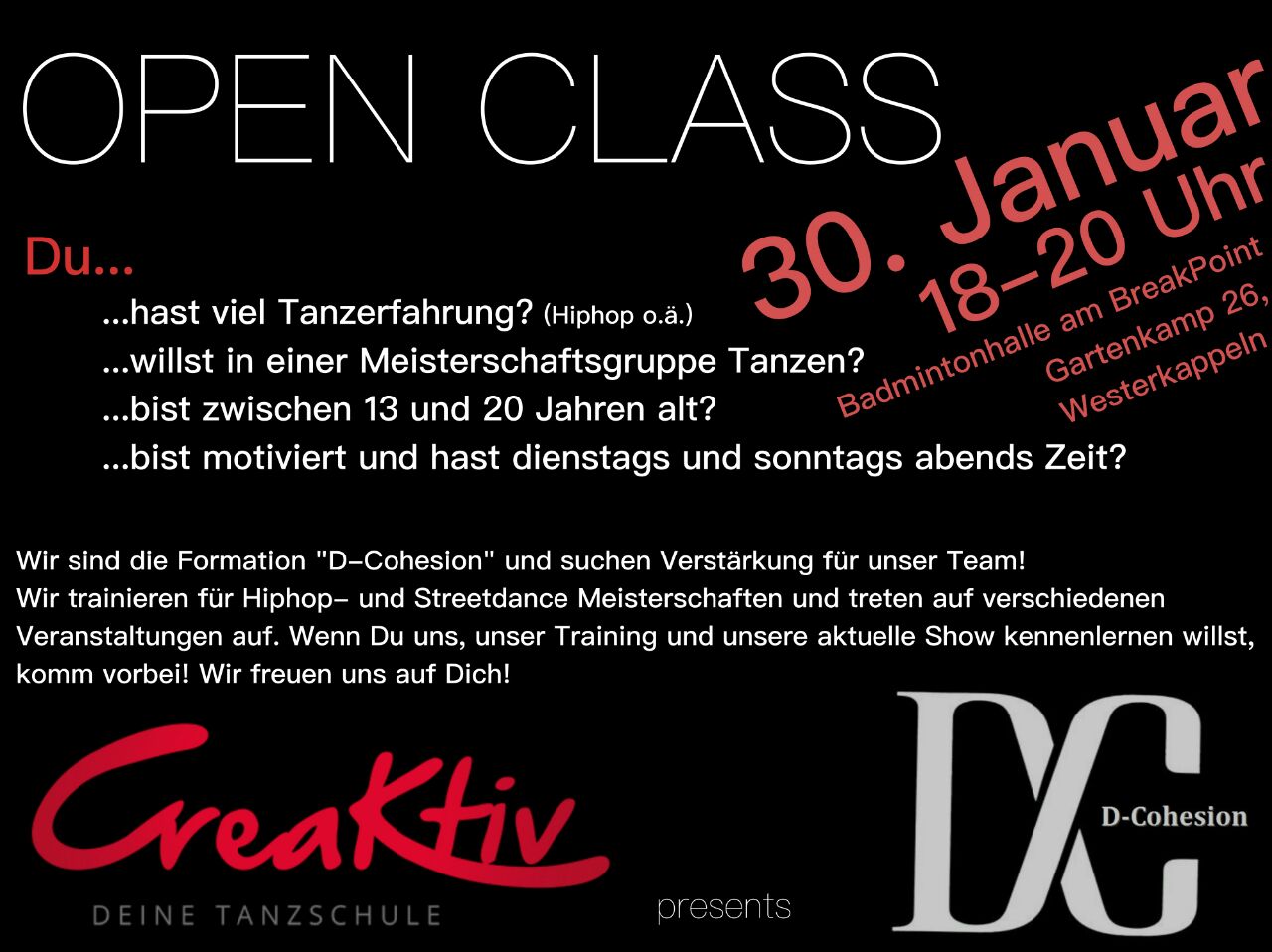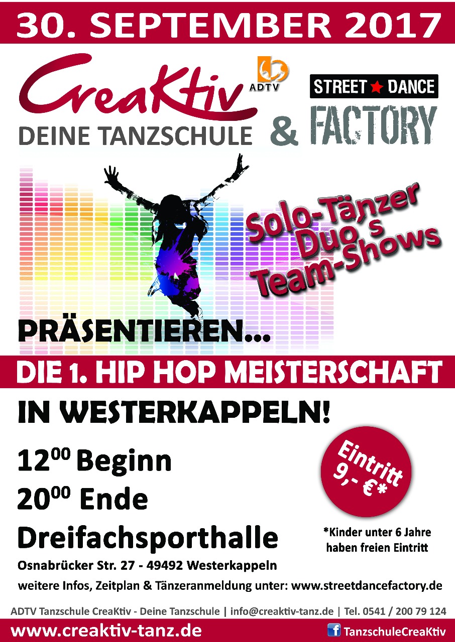 Die Tanzschule CreaKtiv präsentiert den ersten Hiphop-Contest der StreetDanceFactory in der Dreifachsporthalle Westerkappeln. Gesucht werden die besten Tänzer aus dem Raum Osnabrück und Umgebung. Aber auch Tänzer aus ganz Deutschland sind bei dieser offenen Meisterschaft herzlich willkommen. Egal ob Tanzschule, Sportverein, Jugendzentrum oder Privat – jeder kann mitmachen!