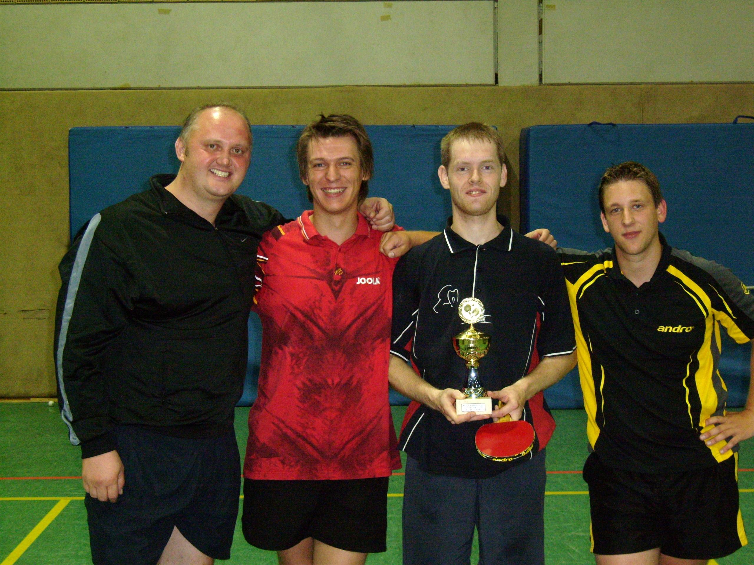 Bereits in der Vorrunde gab es eine große Überraschung. So setzte sich Jugendspieler Ansgar LütkeGlanemann in Gruppe C unerwartet als Zweiter durch und zog ins Achtelfinale ein. Dem hingegen mussten sich Routiniers wie Rolf Riecke, Peter Janik und Roland Hünteler mit der Trostrunde zufrieden geben. Ungeschlagen in die Runde der besten 16 zogen Oliver Wierich, Sascha Mochner und Erik Moldenhauer ein. Für Mochner und Moldenhauer sollte im Viertelfinale jedoch Endstation sein. So verlor Sascha Mochner gegen Oliver Dörn aus der vierten Mannschaft völlig unerwartet mit 1:3, Erik Moldenhauer unterlag Oliver Wierich glatt in drei Sätzen. Wierichs nächster Gegner sollte nun Turnierfavorit Sven Häring sein, der sich im Viertelfinale nach 0:2 Satzrückstand knapp mit 13:11 im Entscheidungssatz gegen Andre Mochner durchsetzen konnte. Aber auch diese vermeintlich große Hürde nahm der Spieler des zweiten Herrenteams ohne Probleme und zog durch einen weiteren 3:0-Sieg ins Endspiel ein. Dort traf er auf Vorjahressieger Daniel Garsetz, der in der Vorschlussrunde mit 11:9 im fünften Satz gegen Oliver Dörn die Oberhand behielt. Das Finale entwickelte sich zu einem reinen Nervenkrimi. Nach verlorenem erstem Satz (11:13) kam Titelverteidiger Garsetz besser ins Spiel und entschied den folgenden Durchgang mit 11:7 für sich. In den Sätzen drei (12:10 für Wierich) und vier (11:6 für Garsetz) zeigte sich nun, dass die beiden Akteure zu Recht im Endspiel standen. Mit schönen Ballwechseln ging es in den alles entscheidenden fünften Durchgang, den Oliver Wierich letztlich mit 11:8 zu seinen Gunsten beenden konnte und somit erstmals den Siegerpokal in seinen Händen halten durfte. Dritter wurde Sven Häring (3:0 gegen Dörn). In der Trostrunde setzte sich Roland Hünteler durch einen ebenfalls glatten 3:0 Satzerfolg im Finale gegen Peter Janik durch.